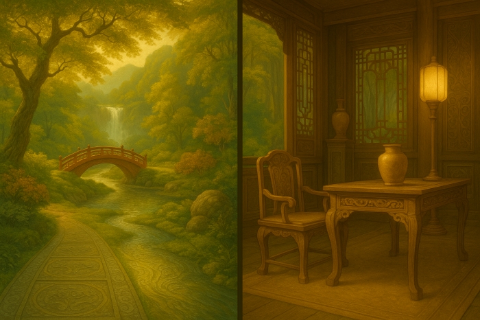 Мебели было немного, но каждая деталь — от изгибов столешниц до изгибов резных спинок — говорила о филигранной работе мастера. Поверхность дерева словно оживала под пальцами, а искусно высеченные узоры переливались в свете фонарей. Даже те, кто не разбирался в тонкостях столярного ремесла, не могли не восхититься такой тщательной работой.