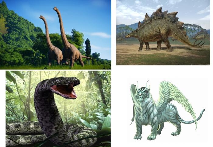 П.р.: Титанобоа — огромная змея, брахиозавр и стегозавр — динозавры, цюнци – мистический лев с крыльями и рогами, таоте — изображение чудовища, которое часто встречается в орнаментах на бронзовых изделиях династий Шан и Чжоу, Гунгун — сын духа воды Гунгуна, обладал телом змеи, человеческим лицом и ярко-красными волосами.