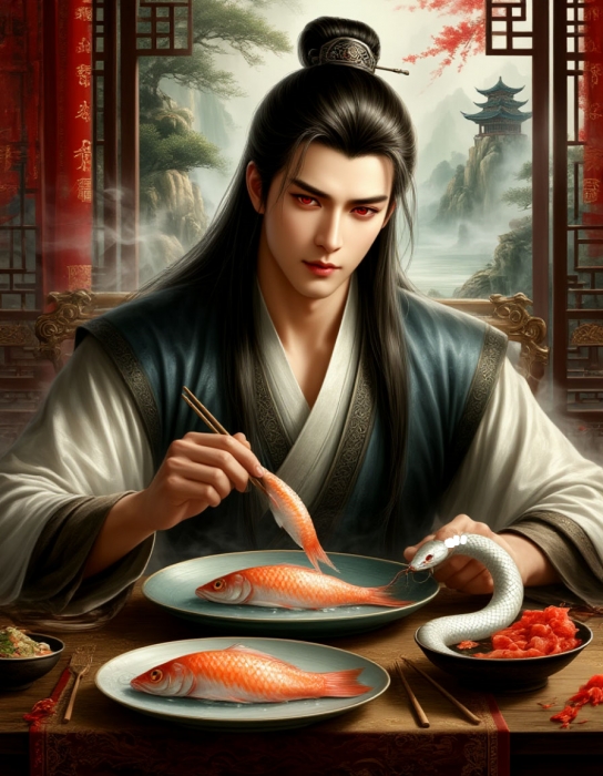 Ци Янь крепко сжал палочки для еды, вены на его руках вздулись, в глазах появился кровавый отблеск. Он медленно протянул руку и... подвинул тарелку с рыбой к белой змее.