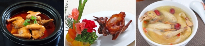 Тушёный в красном масле молодой голубь, хрустящий жареный голубь, суп из голубя с красными финиками: