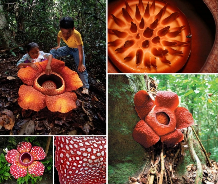 Цветки Раффлезии Арнольда – самые крупные одиночные цветки, известные науке (диаметр 60-100 см, масса – до 8 кг). Цветок имеет пять толстых, мясистых лепестков, покрытых светлыми бородавчатыми пятнами. Они окружают центральную дискообразную часть, покрытую шипообразными отростками. Эти шипы защищают цветок.