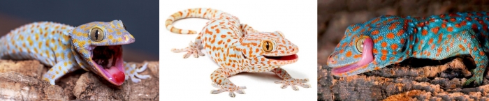 4 Геккон токи (лат. Gekko gecko) – ящерица из семейства гекконов. Длина от 20 до 40 см, вес 150-300 г. Окраска верхней стороны тела светло-оливкового, серого или голубоватого цвета с многочисленными оранжево-красными и белыми кольцами и пятнами. Кожа нежная и бархатистая, может темнеть или светлеть в зависимости от фона окружающей обстановки. Для молодых гекконов характерны расположенные на хвосте яркие чёрные и белые поперечные полосы, что в сочетании с резкими движениями хвоста используется для отпугивания врагов. Ведут в основном ночной образ жизни.