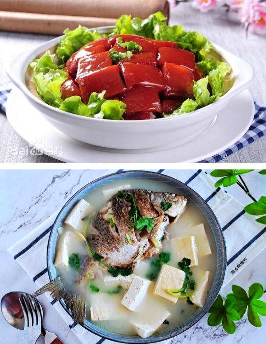 Свинина, тушёная в соевом соусе, и рыбный суп с тофу