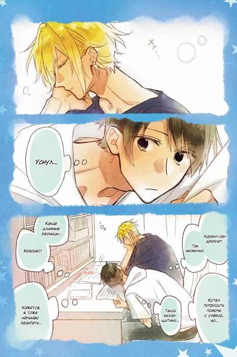 Когда он останавливается, чтобы потянуться посреди работы, чтобы тело не затекло, Хирано помогает ему, и именно в такие моменты он подумывает просто пойти спать. Если он попросит, Хирано, возможно, даже позволит ему положить голову к себе на колени.
