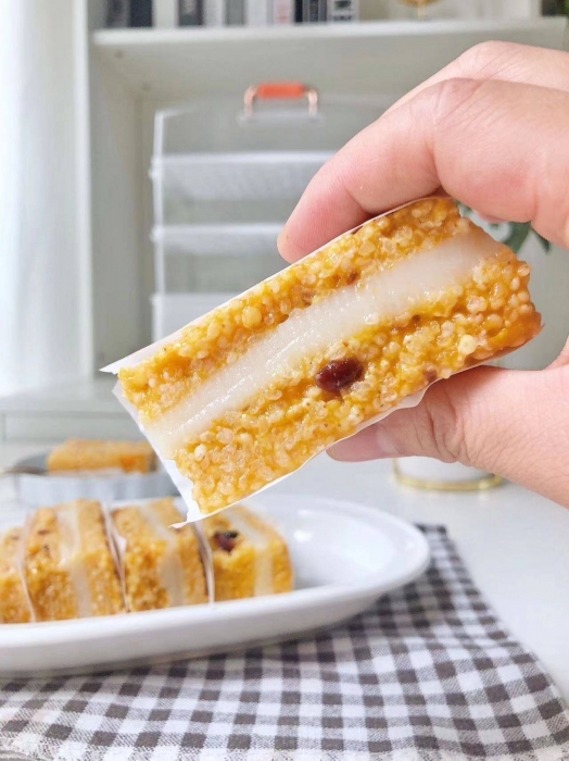 Цяо Юань планировал сделать пять слоёв: основа — варёный фиолетовый клейкий рис, предпоследний слой — смесь муки из жёлтого проса и пасты из красной фасоли, третий слой — клейкая рисовая мука с коричневым сахаром, замешанные до состояния кашицы, чтобы получился эффект лопнувшего пузыря, второй слой — снова мука из жёлтого проса, а самый верхний — густо усеян финиками в сиропе.