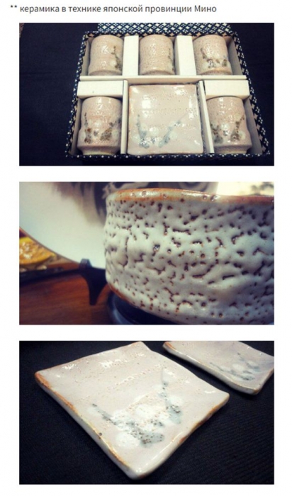 На подносе стояла большая миска из набора посуды Мино**, наполненная куриной кашей. Куриный бульон следует томить очень долго, чтобы он приобрел столь аппетитный молочно-белый цвет. Приготовленный на таком бульоне рис приобретает его аромат, каждое зернышко насыщается вкусом. Рис перемежался с белоснежными кусочками курицы, а сверху каша была посыпана хрустящими белыми семенами кунжута.