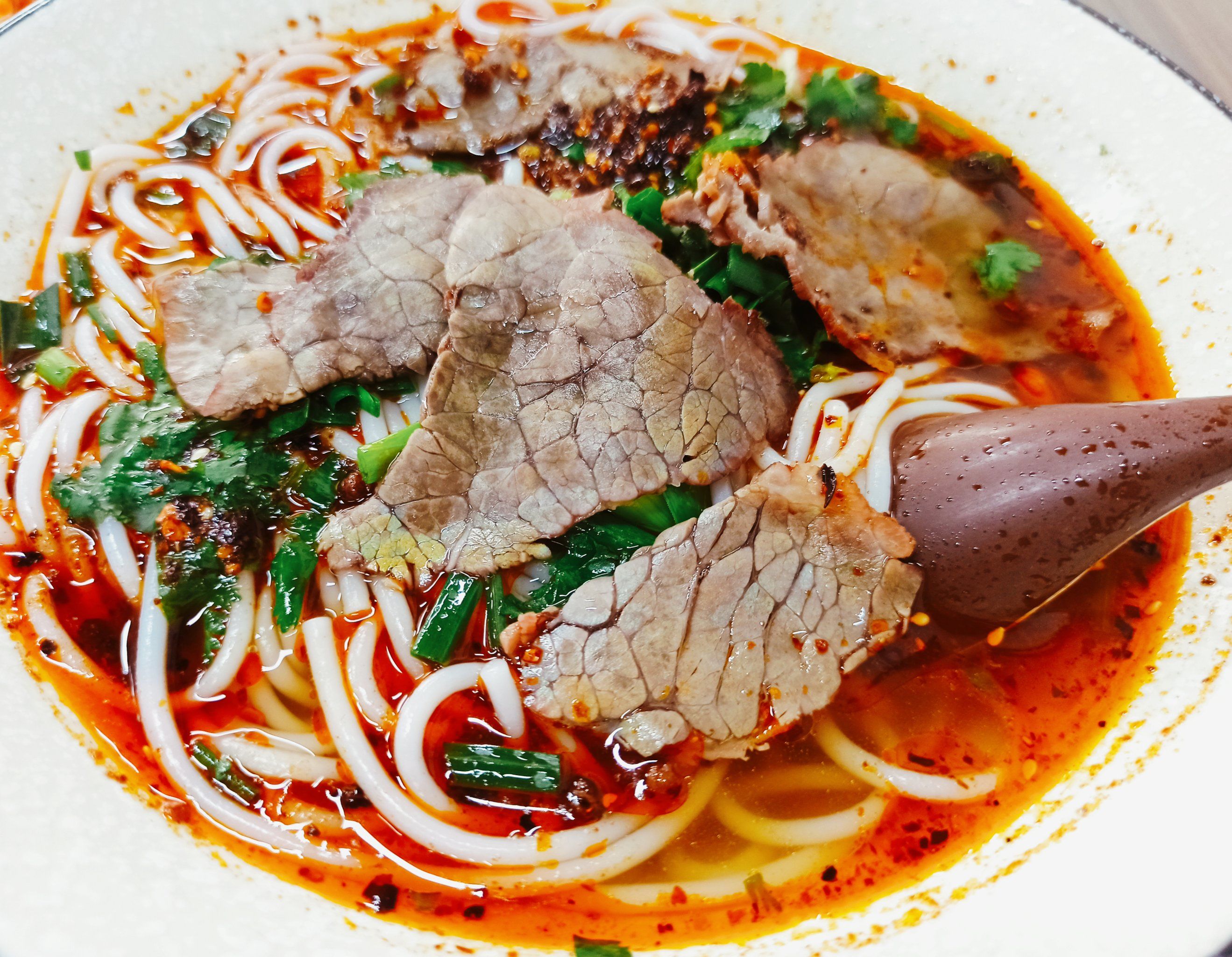 Пока они разговаривали, хозяин подал свежеприготовленную лапшу, дымящуюся и источающую богатый аромат. Лу Цинцзю взял палочки, попробовал лапшу и вздохнул: «Тот же вкус, что и раньше». Лапша, не содержавшая желатина, была мягкой и эластичной, пропитанной ароматным бульоном из костей, что придавало ей восхитительный вкус. Приправа была простой: обжаренные перцы чили и свежий зеленый лук, залитые горячим бульоном. Лук прекрасно компенсирует жирность бульона.