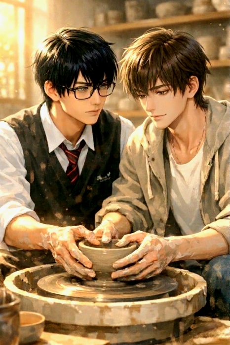 Сначала Сюй Цзинъю заложил базу, затем Юань Мань начал формировать стенки. Пока круг вращался, Юань Мань снова по привычке засуетился, пытаясь резко вытянуть глину вверх. В этот момент мастер хлопнул Сюй Цзинъю по плечу и велел ему прижать свои ладони поверх рук Юань Маня.