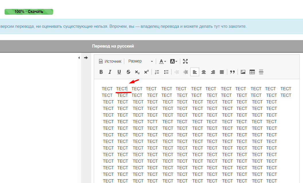 После нажатия, нас переводит на вкладку импортирования текста, в графе перевод на русском, мы находим ошибку и исправляем ее.