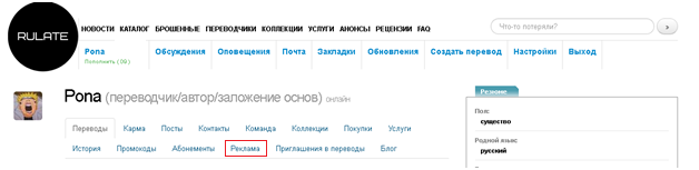 Все текущие, прошедшие и запланированные рекламы на сайте, отображаются в меню пользователя «Реклама».
