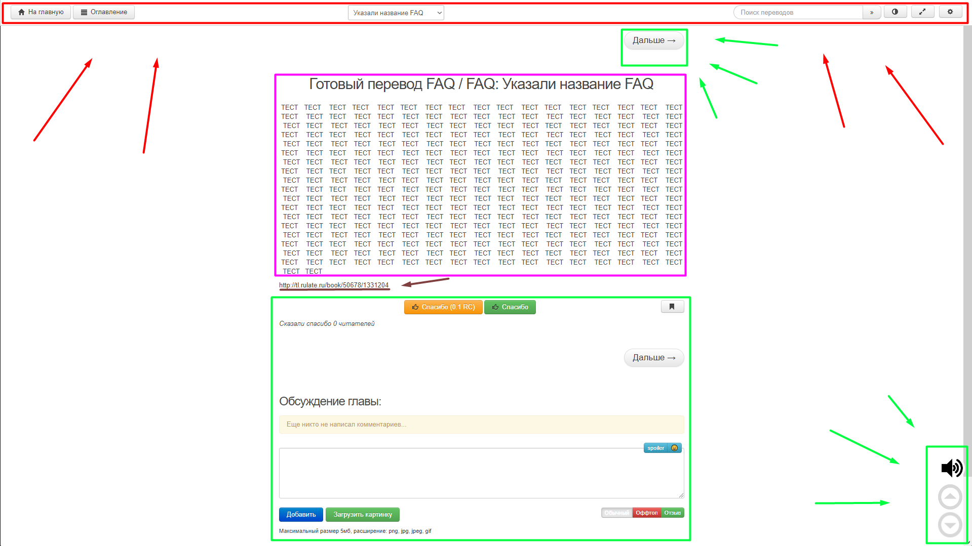 В розовой зоне(Скрин №3, №4) располагается сам текст доступный для чтения. Если глава не была заполнена, по умолчанию, всем пользователям, в розовой зоне, будет отображаться название главы и адресная строка на главу.