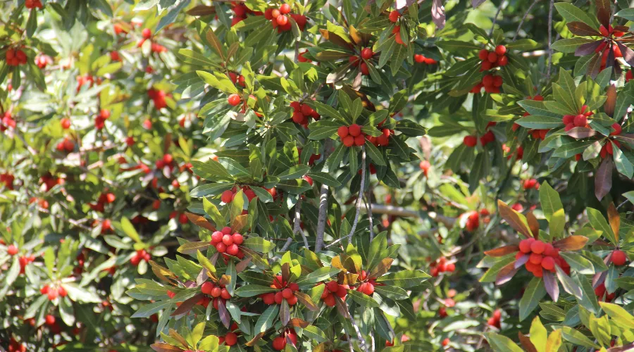 [*Восковница красная (Myrica rubra), также известная как янгмэ, ямамомо, восковая ягода, китайская земляника – плодовое дерево семейства Мириковые, распространенное в Восточной Азии.]